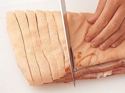 Brush the skin with the vinegar and leave to dry. Repeat three times, then rub the pork skin with the salt.