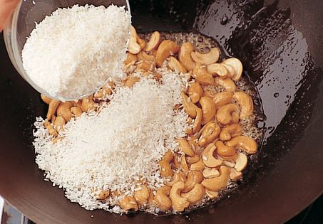 Heat the oil in a wok or large frying pan and then stir in the honey. After a few seconds add the nuts and coconut and stir-fry until both are golden brown.