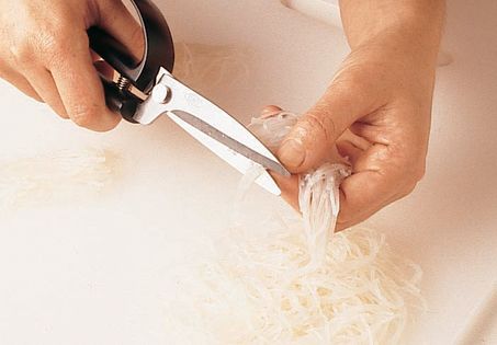 Place the noodles in a large bowl, cover with boiling water and soak for 10 minutes. Drain the noodles and snip them into 5cm/