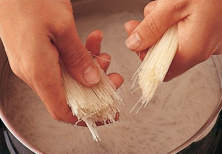 Bring a large pan of lightly salted water to the boil. Snap the noodles into short lengths, add to the pan and cook for 3–4 minutes. Drain, then rinse under cold water and drain again.