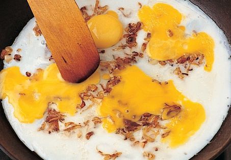 Heat the oil in a frying pan. Add the garlic and cook over a low heat until it starts to turn golden. Crack in the eggs. Break the yolks with a wooden spatula, then fry until the eggs are almost firm. Remove from the pan and set aside.