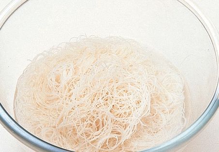 Put the rice vermicelli in a wide heatproof bowl, pour over boiling water and leave to soak for 10 minutes. Drain, refresh under cold water and drain well again. Tip into a large serving bowl and set aside until required.