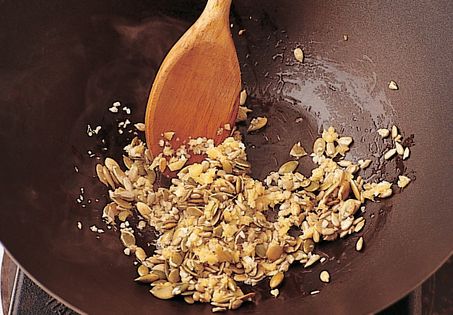 Heat the oil in a wok or large frying pan. Add the seeds. Toss over a medium heat for 1 minute, then add the garlic and ginger and continue to stir-fry until the ginger is aromatic and the garlic is golden. Do not let the garlic burn or it will taste bitter.