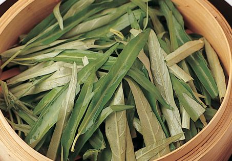Morning glory goes by various names, including water spinach, water convolvulus and swamp cabbage. It is a green leafy vegetable with long jointed stems and arrow shaped leaves. The stems remain crunchy while the leaves wilt like spinach when cooked.