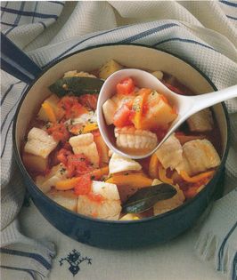 In this stew, all the ingredients except the fish and tarragon are cooked first, then these are added so the fish is gently poached only for the last few minutes of the cooking time.
