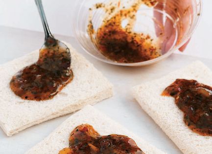 Divide the sauce and chutney mixture between three of the slices of bread. Top each slice with the remaining bread to make three sandwiches. Cut each sandwich