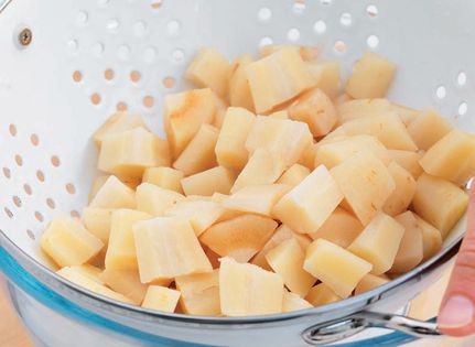 Put the parsnips into a pan and pour in enough water to cover them. Add a pinch of salt and boil for 7-8 minutes, until tender but firm. Drain in a colander.
