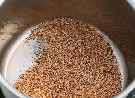 Dry-roast the poppy seeds in a heavy pan over a medium heat. Stir constantly for about 1 minute or until they are just a shade darker. Do not allow them to become too dark.