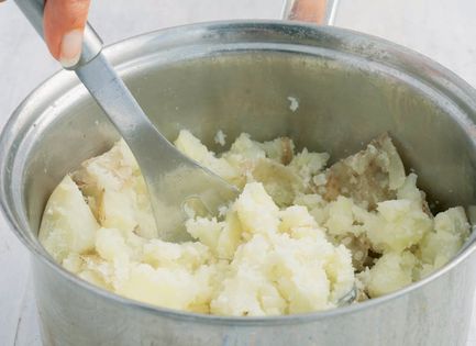 Peel the potatoes, cut them into chunks, then boil them in a large pan of salted water for about 10 minutes, until they are soft. Drain well, then mash until smooth.