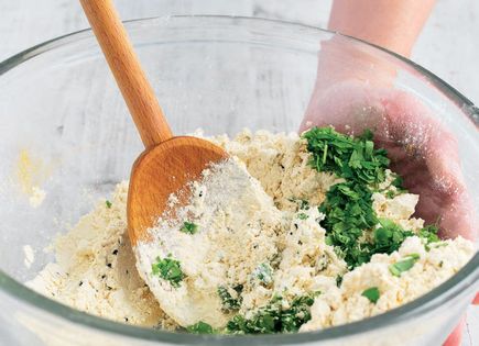 Sift the gram flour into a large mixing bowl and add all the remaining ingredients, except the cauliflower and vegetable oil. Stir everything together to combine, then make a hollow in the middle.