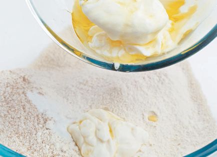 Put both types of flour into a large mixing bowl and work in the salt and baking powder. Add the oil and yogurt and mix with your fingertips.
