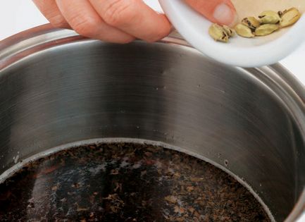 Put the water, tea and cardamom pods into a pan and bring to the boil.