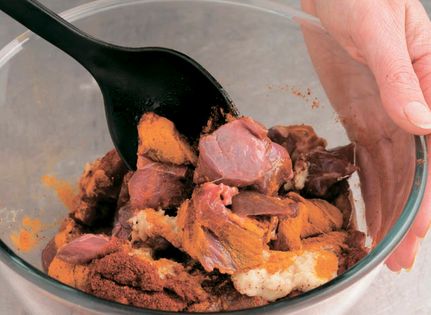 Put the meat in a large non-metallic bowl and add the vinegar, turmeric, garlic, ginger, chilli powder, tomato purée and salt. Mix thoroughly, cover the bowl with clear film (plastic wrap) and leave to marinate for 4–5 hours.