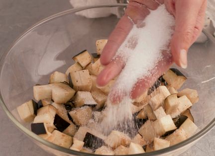 Cut the aubergine into 2.5cm/1in chunks. Place in a bowl and sprinkle with the salt.