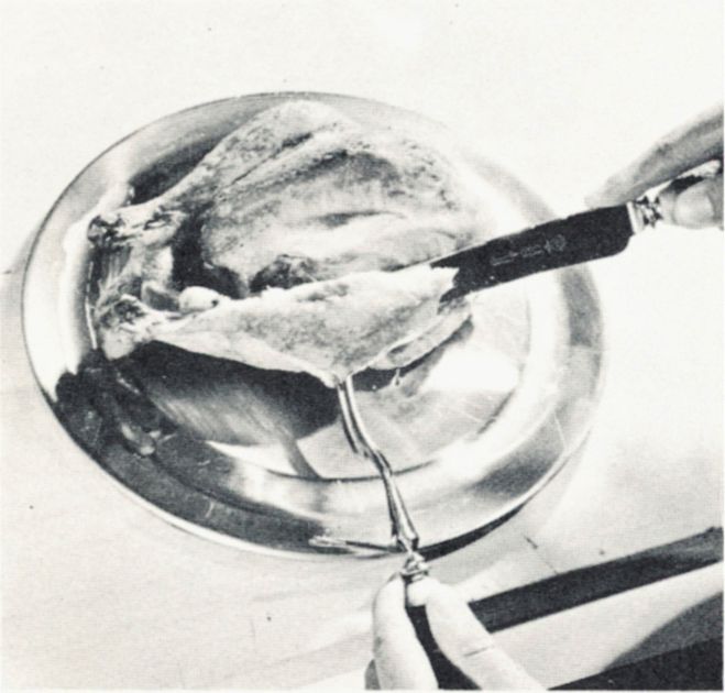 Ladies—protect your males from obscurity and let them carve. The joint must be carved by the man of the house and it is better to do this at the table in all cases but that of duck for the reasons shown below.