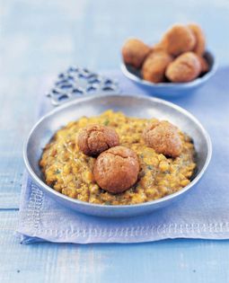 This delicious spiced mung bean and lentil dhal is topped with wholemeal balls, known in India as baatis. Ghee works best for the traditional Indian flavour, however butter, sunflower oil or plain olive oil can be used instead.
