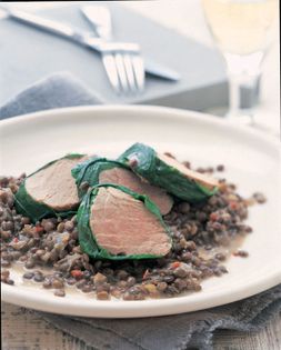 This lean pork tenderloin is succulent and delicious - the meat is wrapped in spinach, cooked on a bed of tiny French Puy lentils and flavoured with coconut.