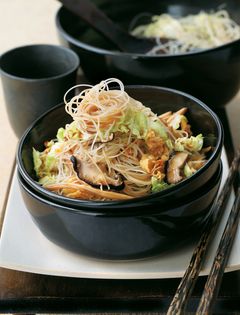 This is not an overly seasoned dish but rather a light and fresh-tasting dish that is perfect for a lunch or a midweek supper. The bean curd skins add colour and a crisp texture to this simple noodle recipe.
