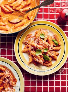 I’ve no idea who came up with the idea of adding vodka to a tomato sauce served with pasta, but this sauce really is delicious. I read somewhere that pasta alla vodka peaked in the 1980s after being served in nightclubs across America. I really hope this is true because I love the thought of clubbers dressed in their finest fashion trying to stay clean while battling with this vibrant orange sauce.