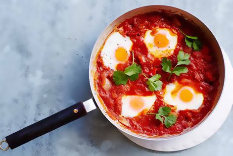 Add in the tomatoes and tandoori spice and give it all a good stir. Make four small indents in the mixture and then gently crack an egg into each hole. Season with salt and pepper.