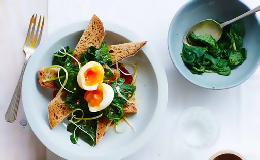 Bring a medium saucepan of water to the boil, then lower the heat to a gentle simmer. Carefully lower 2 eggs into the water using a spoon and cook them for 5 minutes.