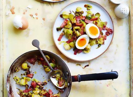 Melt the butter in a non-stick frying pan over a medium-hot heat. Add the sprouts and bacon and mix together. Place a lid or large plate over the frying pan, turn the heat to medium-low and co