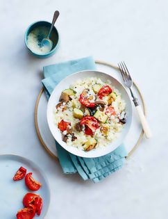 - If the mushrooms are on the large side, cut them in half. Add them to a large bowl along with the courgette cubes and cherry tomatoes.