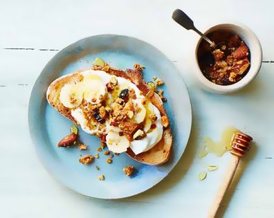 Spread 1 tablespoon of Greek yoghurt on each piece of toast, followed by 2 tablespoons of granola and slices of ripe banana.