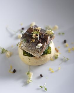 Sardines are brushed with soy sauce, grilled, and accompanied by brioche with umami-rich nori worked into the dough. Ocean’s bounty joins mountain’s blessing (Roquefort cheese) for a superbly intense taste.