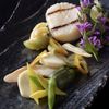 Serve the dressed scallop and vegetables on individual plates and garnish with shaved almonds, trout roe and the reserved nukazuke vegetables.