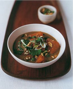 In a large pot, heat the vegetable oil and sauté the onion until it is just beginning to caramelize. Add the curry paste and garlic, and fry for a minute, stirring often. Then add the peanuts and fry for another minute, again stirring well to prevent the mixture sticking.