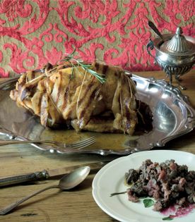 This is quite lovely, noble looking &, most of all, easy. It’s rather like doing a roast chicken with a bit of a stuffing sauce on the side. Prepare as for a chicken, keeping the liver if your guinea fowl comes with one. This is particularly lovely with cabbage or the roast pumpkin & mushrooms. I have seen many different versions of this sauce; some elaborate with vinegar, crumbed bread, anchovies, onions or various spices, & it works very well