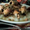 In Venice small birds are used for this – tordi, merli or fringuelli. We used fringuelli which Mariella happened to have in her freezer. Ten small birds weighed 200 g (7 oz). You will probably find quail are more readily available, depending on where you live, but if you do use the small birds you’ll only need to roast them for 30 minutes. I use slices of peppery pancetta for wrapping them.