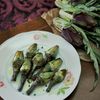 Castraure are beauties – the small bitter first artichokes that bud on the island of Sant’ Erasmus (a nice vaporetto ride from the fondamenta Nuova). They are considered a prize & are much appreciated – so small & perfect that it is not necessary to take out a choke. Make as many as will fit in a large non-stick frying pan (I have said about 25 here but yours may be of a different size). If you don’t have castraure, use ordinary artichokes, quartered. Or baby artichokes. If you have