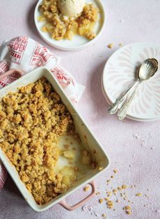 If there’s one recipe that should get you started with baking, it’s a crumble. It is foolproof in preparation, beyond delicious in taste, and works well with virtually any kind of fruit. I’ve tried this recipe with apples and raspberries, plums, rhubarb, and peaches, and all work beautifully. Just be sure to note that each fruit has a different level of sweetness, so you may need to add several spoonfuls of sugar to amplify the taste. Pears require little to no added sugar as their natural