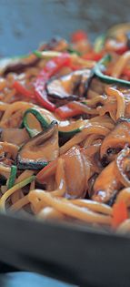 Bring a large pot of water to a boil. Add the noodles and cook for 2 minutes. Drain and rinse well with cold running water. Place in a bowl, add 1 tablespoon of the canola oil, and toss to coat evenly. In a small bowl, stir togethe