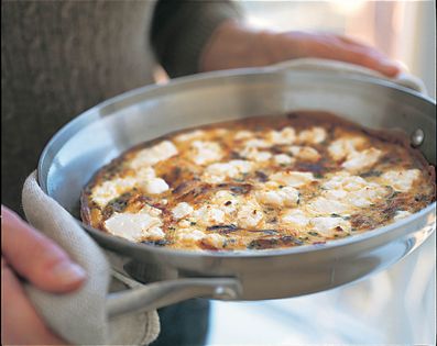 In a heavy 10-inch (25-cm) ovenproof frying pan over medium heat, warm the oil. Add the onion and sauté until golden, 5–6 minutes. Add the red pep