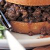 In a large frying pan over medium-high heat, warm the oil. Add the onion and garlic and sauté until softened, about 5 minutes. Add the beef, season with salt and pepper, and cook, stirring to break up any clumps, until browned, about 8 minutes. Add the barbecue sauce, reduce the heat to low, and cook until the meat is well coated and the sauc