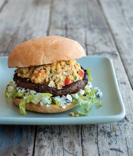 Here, grilled portobello mushrooms are loaded with a spicy chickpea mixture for a satisfying, protein-packed burger. The yogurt-based dressing adds even more protein and is reminiscent of creamy gyro sauce.