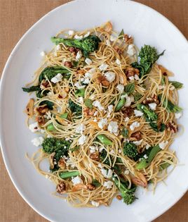 Broccoli rabe looks like a leggy cousin of broccoli, but it’s actually closer to a turnip green, with the same bitter, assertive bite. I mellow the rabe by blanching it and then pair it with nutty quinoa pasta.