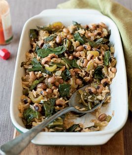 This mix of Cajun-style seasoned rice, collards, and black-eyed peas, also called Hoppin’ John, is delicious anytime. It’s traditionally eaten on New Year’s Day, and is said to guarantee prosperity for the coming year.