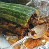 The marrow has been rather forgotten, poor thing. People just don’t seem to know what to do with it. It has a wonderful taste, a combination of pumpkin and courgette. I remember the stuffed ones my mother used to carve up at the table, all piping hot and steaming. Because of their water content, although firm, they do need a lot of gubbins in the middle so that the stuffing-to-marrow ratio is correctly balanced. So you will need at least 1kg of stuffing to a 2kg marrow.