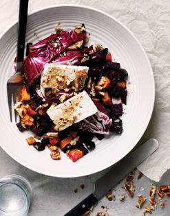 Radicchio is bitter, sometimes overwhelmingly so, but I’ve tamed this dragon with two sweet root vegetables in the form of beets and sweet potatoes. They’re starchy and syrupy, almost like candy, playing perfectly off the radicchio’s palate-challenging edge. This bowl keeps well for a couple of days, even fully dressed.