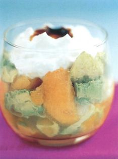 Halve avocado and remove stone. Scoop out flesh and place half the avocado in each glass. Scoop remaining flesh from the melon and place in the glasses, then squeez