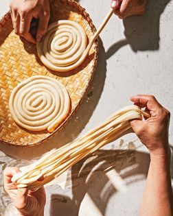 Most of our fans know us for biang-biang noodles that are hand-pulled, ripped, and purposefully disheveled, but the goal of longevity noodles is to create a long, slick, uniform strand, gently pulled over and over again until you get the right thickness. Pros will feed the noodle straight into the pot while pulling in quick, seamless motions, but unless you do this a hundred times a day, you’ll end up with an unevenly cooked strand—al dente on one end, mushy on the other. To avoid that, thi