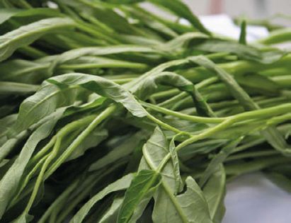 Kangkong is a popular and highly nutritious leafy green vegetable also known as morning glory, water convolvulus or water spinach. It has long hollow stems with pointed, mid-green leaves, which have a soft and crunchy texture and appealing mild flavor when cooked. Young shoots may be eaten raw as salad or with a dip. The leaves and tender stems are usually braised. Fresh kangkong is widely available now in supermarkets or Asian food stores. Kangkong does not keep well; wrap in newspaper or cloth and refrigerate for 1 to 2 days. If not available, use spinach or bok choy as a substitute.