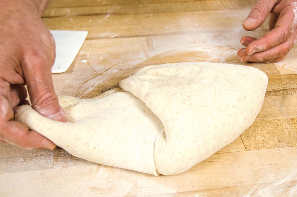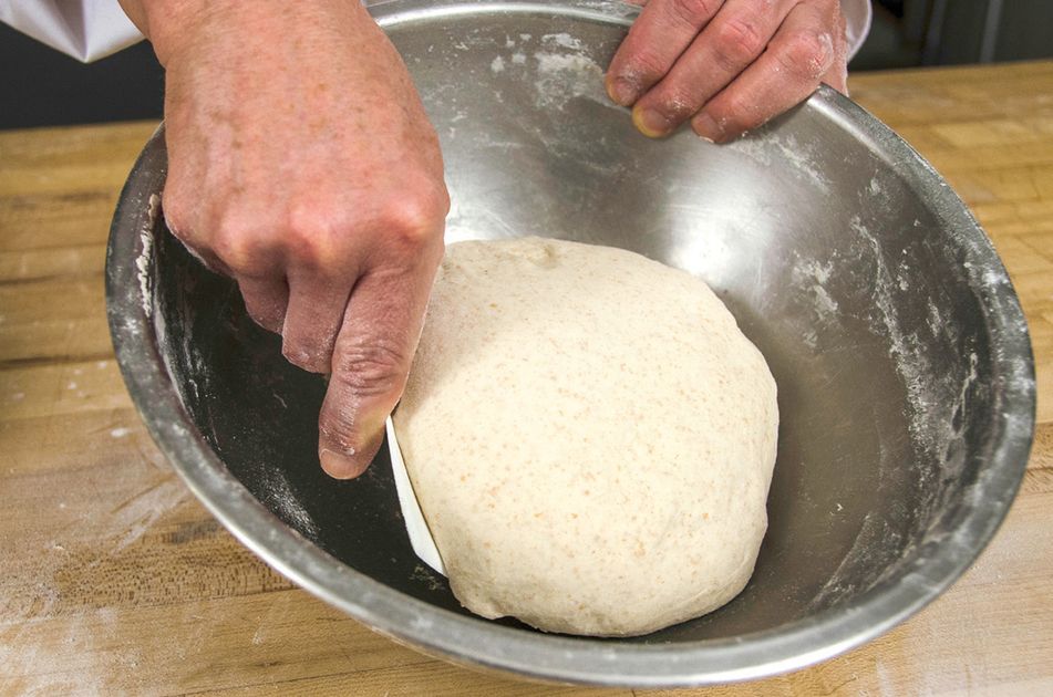 Use both hands to invert the dough. Gently tuck the edges underneath. With a scraper, return the dough to its Fermentation container. Cover with plastic, as before.