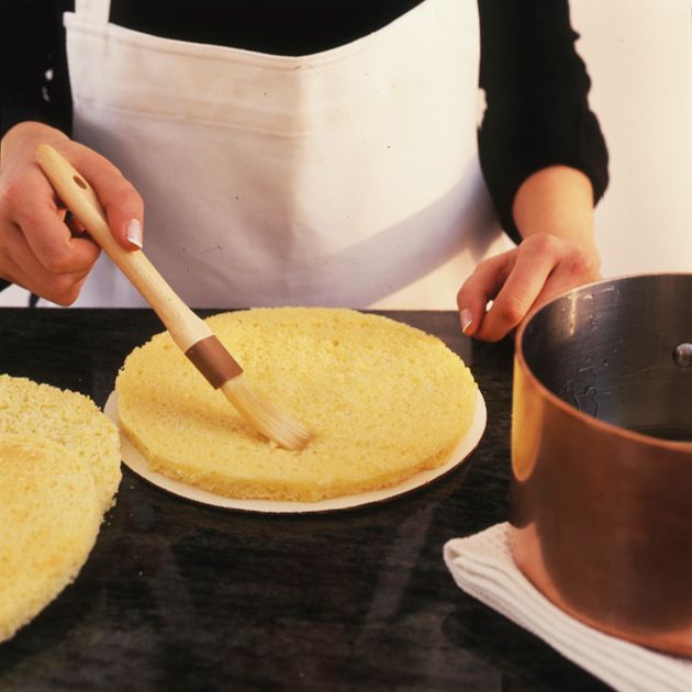 Put one of the cake layers in the center of the cardboard and brush with the flavored syrup.