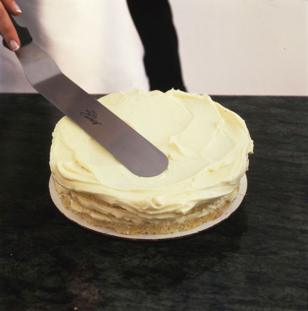 Heat a long metal spatula by dipping it in hot water or waving over a hot flame. Wipe the spatula dry if it’s wet and smooth the cake with the warm spatula.