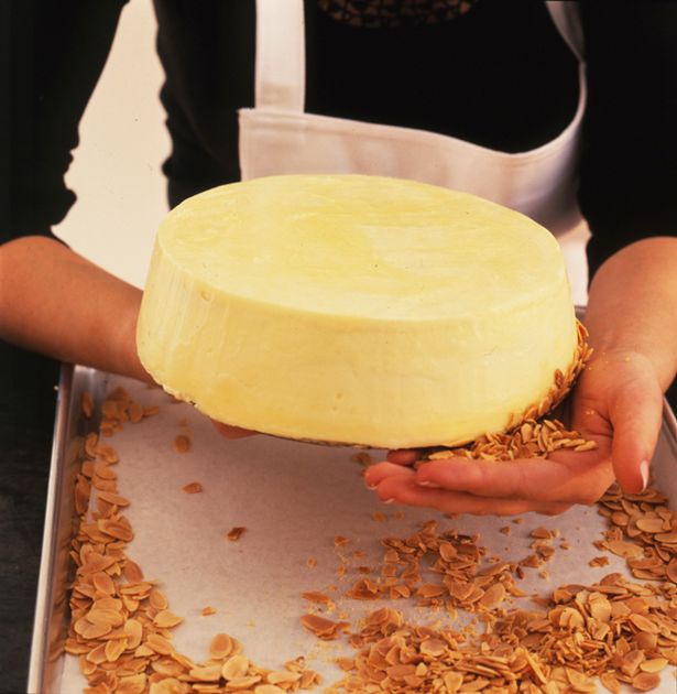 Hold the cake up and use your hand to stick a thin rim of toasted almonds all around the sides.